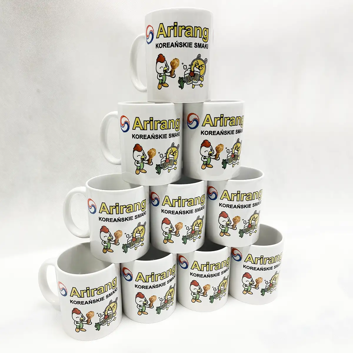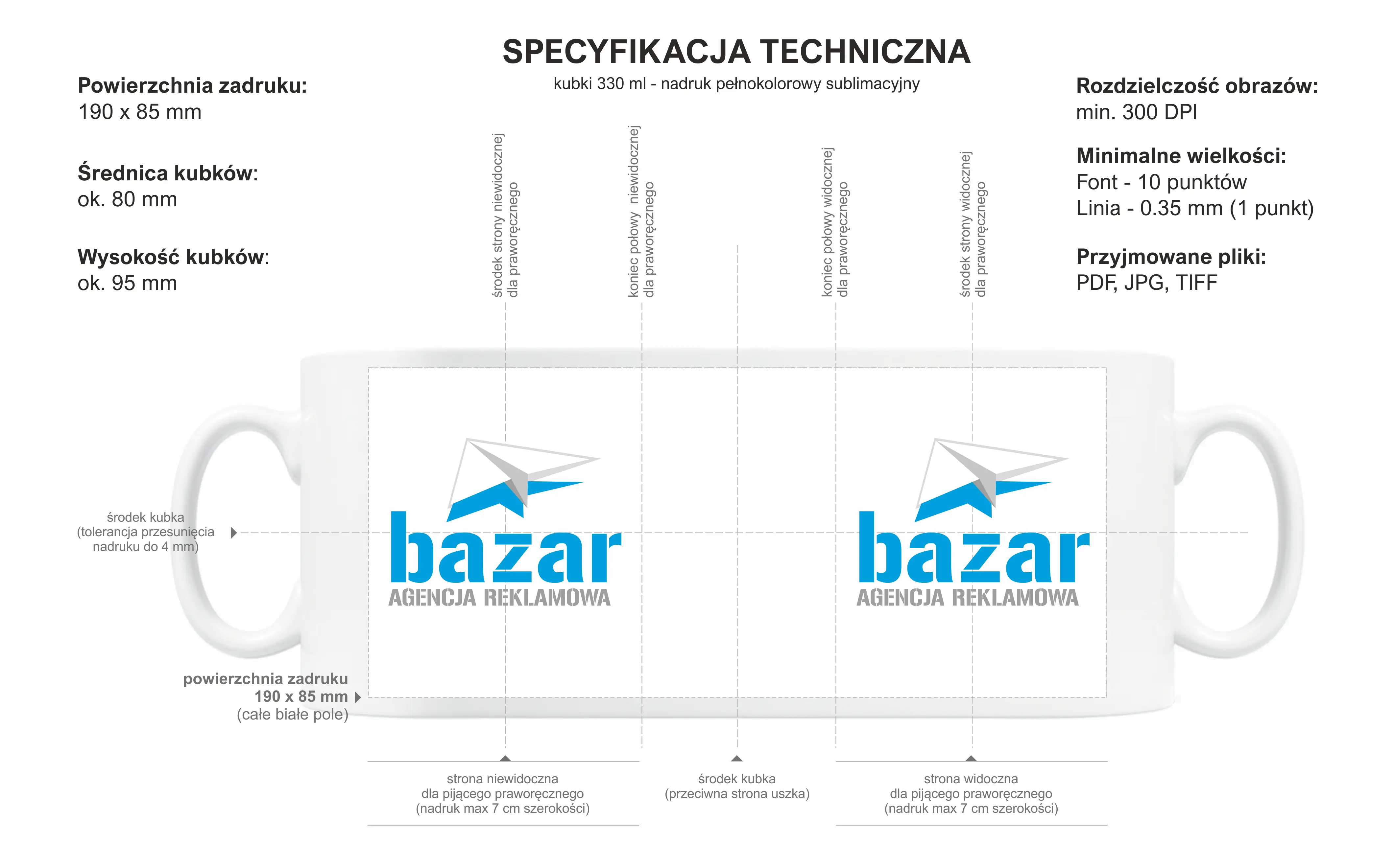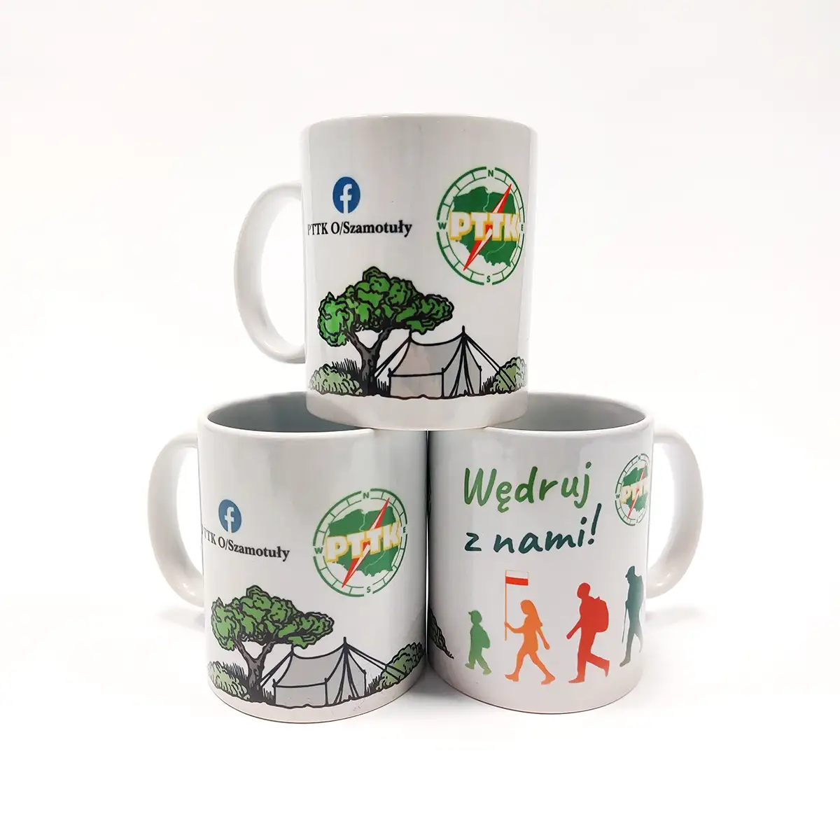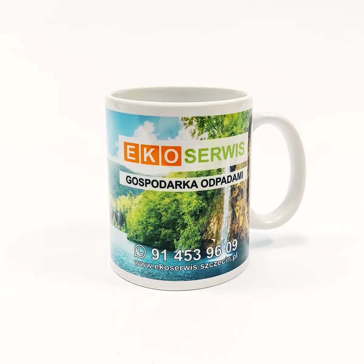 W cenie produktu na kubkach wykonujemy duży kolorowy nadruk dookoła (8,5 x 19 cm) metodą sublimacji.