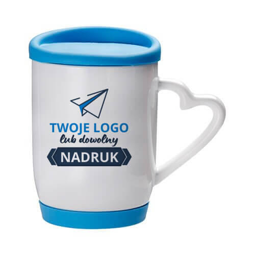 Kubek z błękitną silikonową pokrywką i podstawką – z nadrukiem